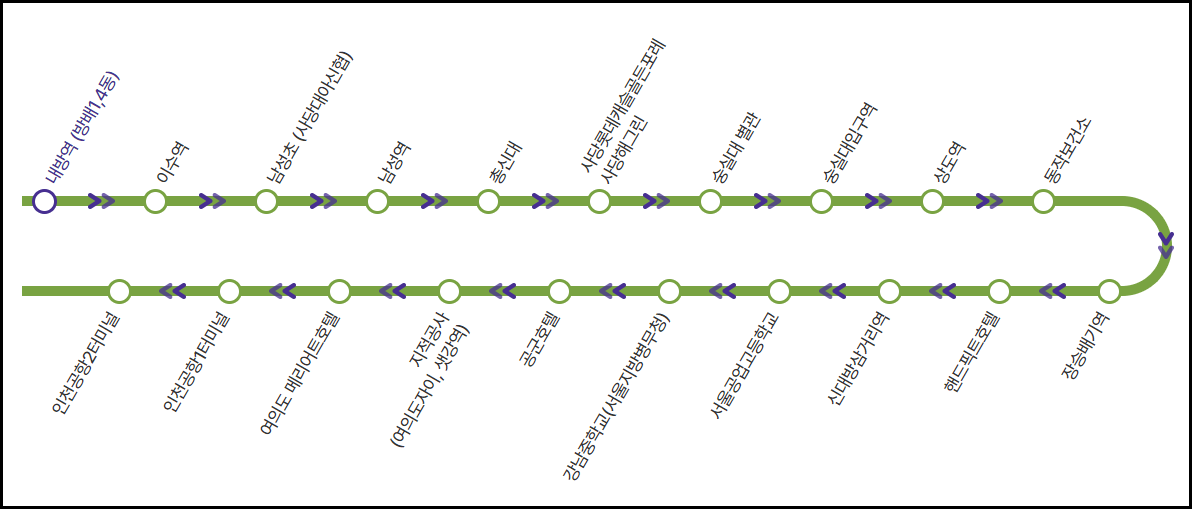 내방역(방배1, 4동) ▶ 이수역 ▶ 남성초(사당대아신협) ▶ 남성역 ▶ 총신대 ▶ 사당롯데캐슬골든포레사당해그린 ▶숭실대 별관 ▶ 숭실대 입구역 ▶ 상도역 ▶ 동작보건소 ▶ 장승배기역 ▶ 핸드픽트호텔 ▶ 신대방삼거리역 ▶ 서울공업고등학교 ▶ 강남중학교(서울지방병무청) ▶ 공군호텔 ▶ 지적공사(여의도자이, 샛강역) ▶ 여의도 메리어트호텔 ▶ 인천공항1터미널 ▶ 인천공한2터미널