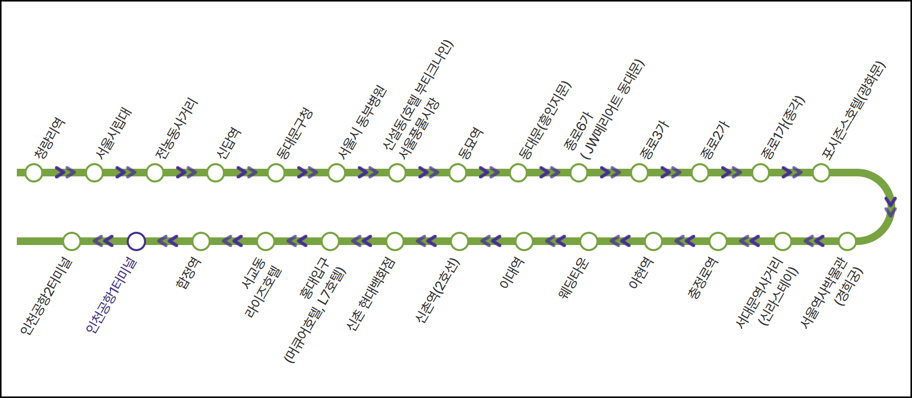 청량리역 ▶ 서울시립대 ▶ 전농동사거리 ▶ 신답역▶ 동대문구청 ▶ 서울시 동부병원 ▶ 신설동(호텔 부티크나인) 서울풍물시장 ▶ 동묘역 ▶ 동대문(흥인지문) ▶ 종로6가(JW메리어트 동대문) ▶ 종로3가 ▶ 종로2가 ▶ 종로1가(종각) ▶ 포시즌스호텔(광화문) ▶ 서울역사박물관(경희궁) ▶ 서대문역사거리(신라스테이) ▶ 충정로역 ▶ 아현역 ▶ 웨딩타운 ▶ 이대역 ▶ 신촌역(2호선) ▶ 신촌 현대백화점 ▶ 홍대입구 ▶ 서교동 라이즈호텔 ▶ 합정역 ▶ 인천공항1터미널 ▶ 인천공항2터미널